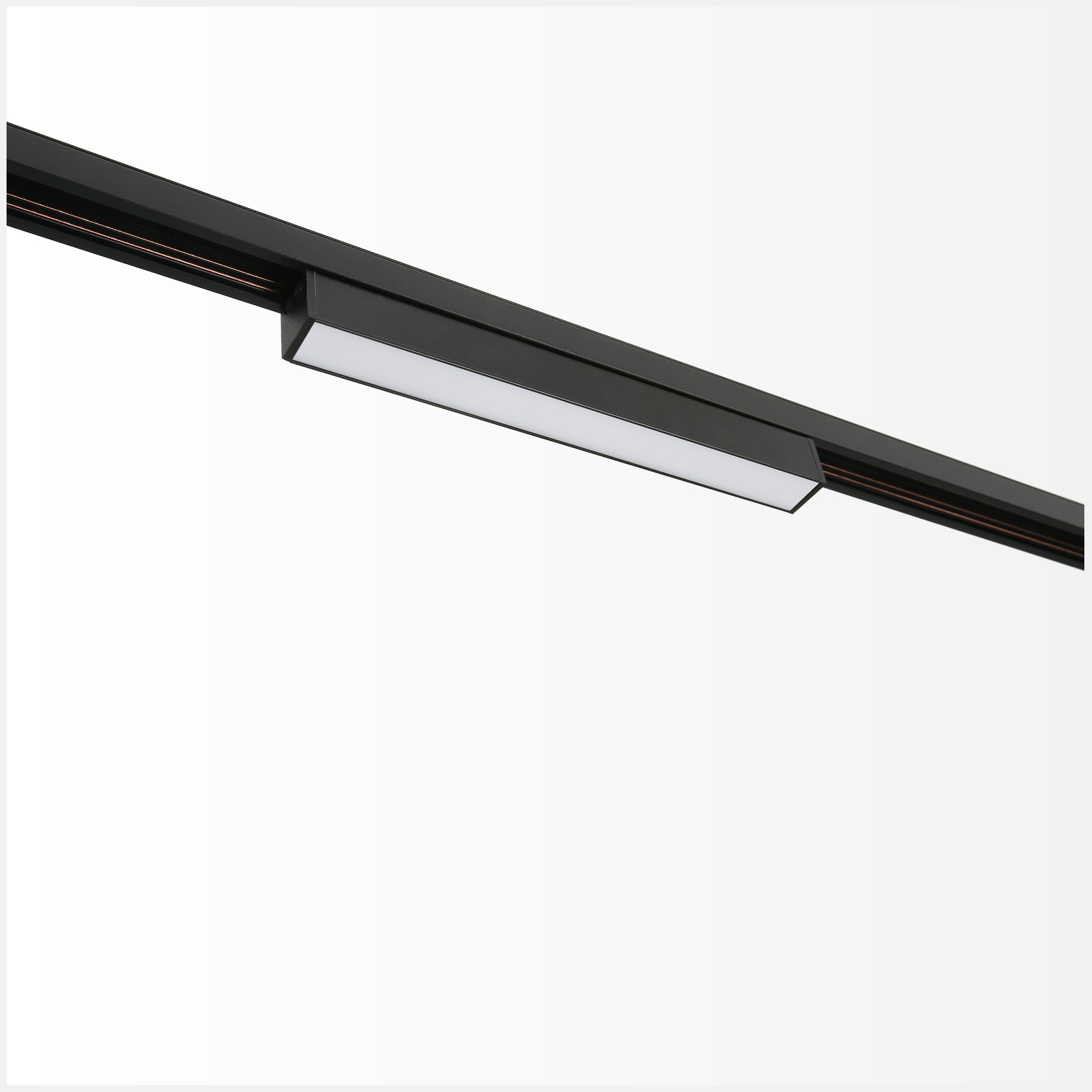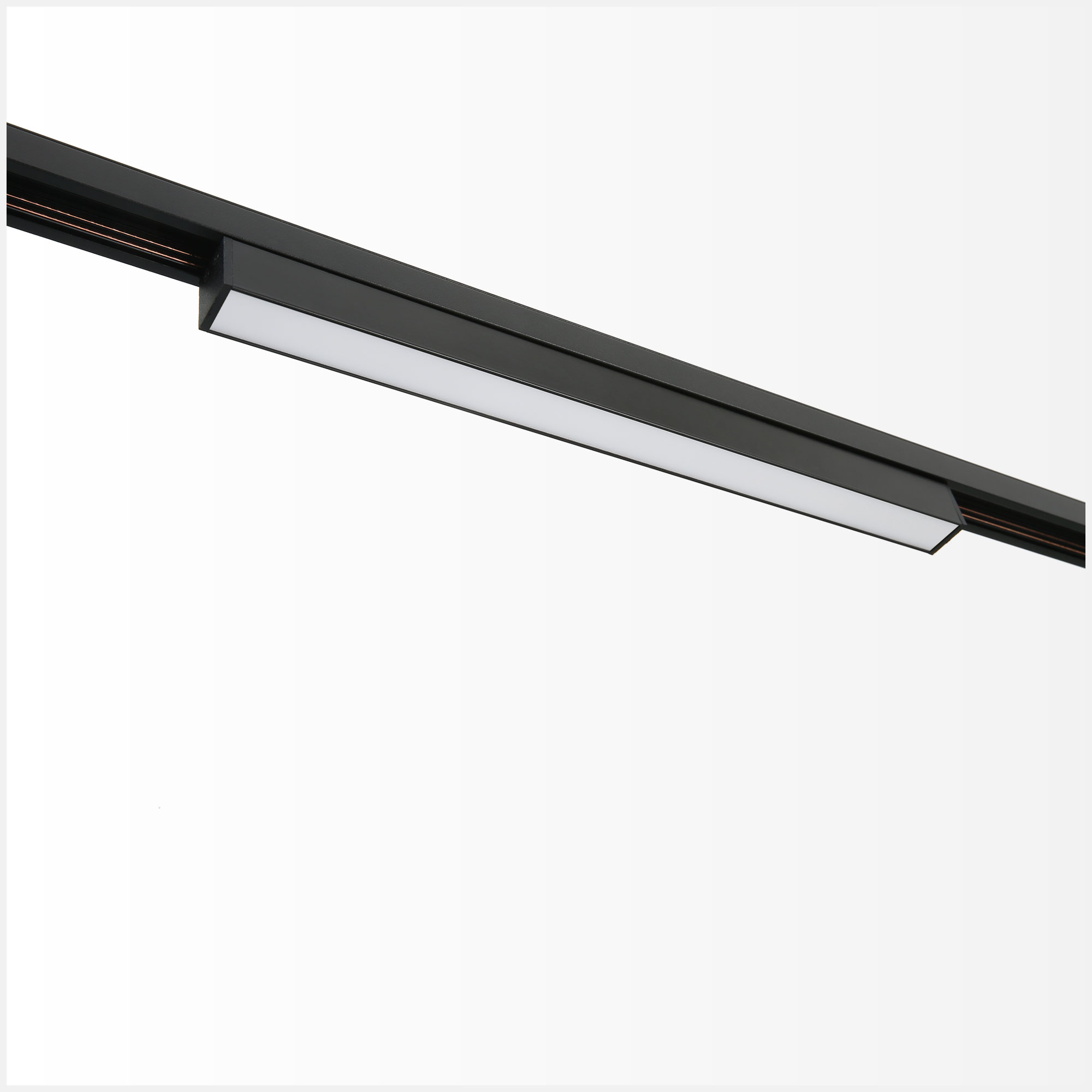 - White, black colour track mounted 48V low voltage spotlight with light body in extruded aluminium inclusive of white opal diffuser for soft and diffuse illumination